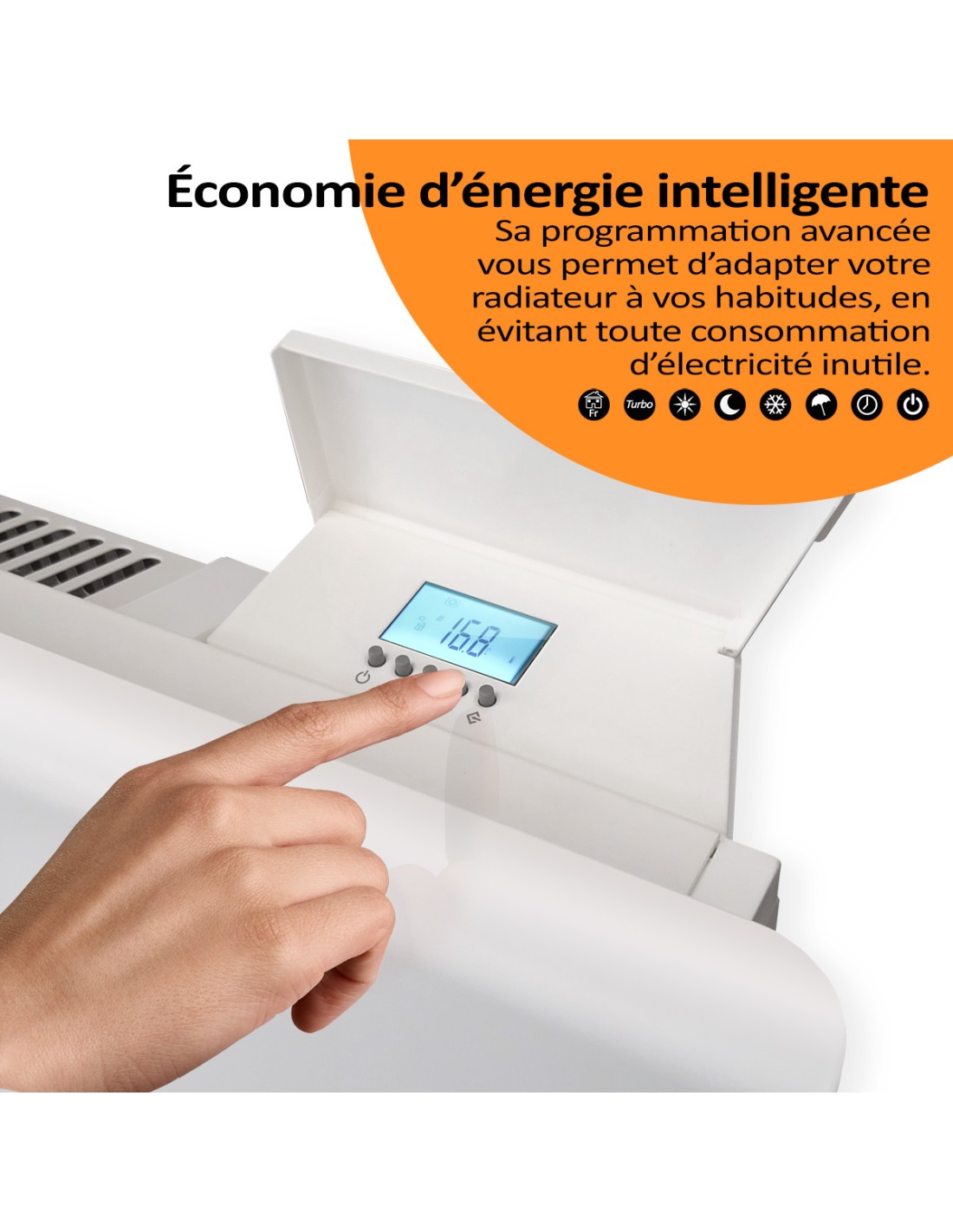 Chronothermostat intuitif et facilement programmable Intégré discrètement dans la partie supérieure de l’appareil. 2 programmes pré-enregistrés et 1 programme libre. Programmation quotidienne et hebdomadaire.
